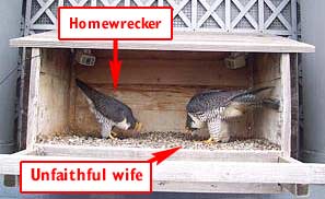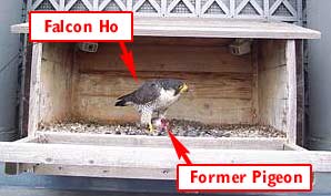 the falcon soap opera continues. Yesterday the new boy in town (whose been nicknamed “mail man” by the folks here at kodak.com) presented a dead bird (read as “food”) to Mariah (our unfaithful momma falcon). This is an important aspect of falcon mating. Basically the male is proving he can provide, as the female can’t hunt while incubating the eggs and watching the hatchlings. Deadbeat dad’s don’t get any in the falcon world. Here’s it happening…